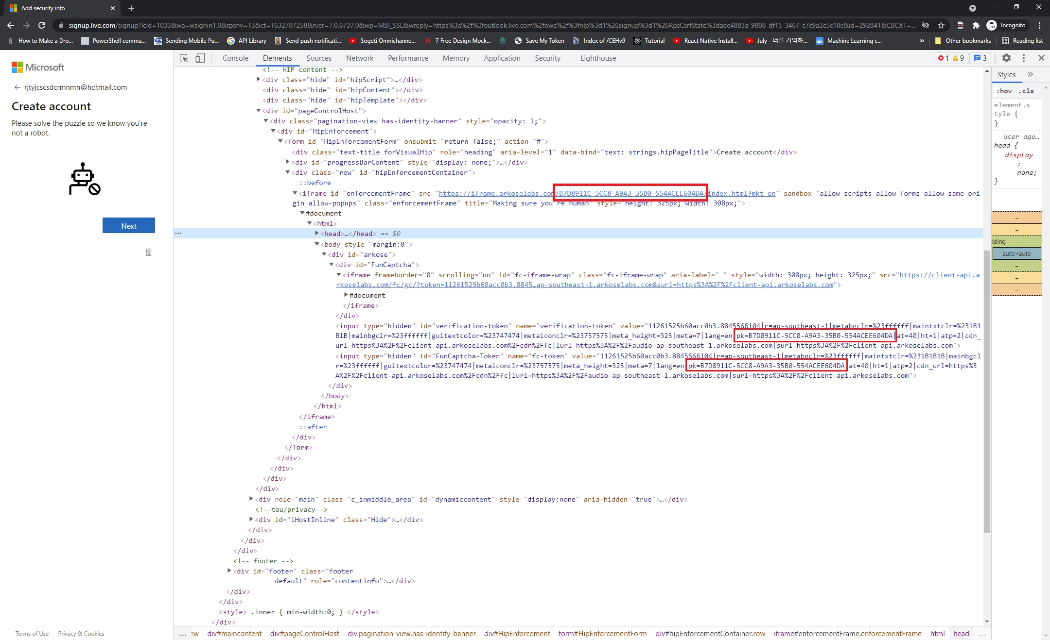 của phần tử div của funcaptcha hoặc bên trong phần tử đầu vào có tên fc-token