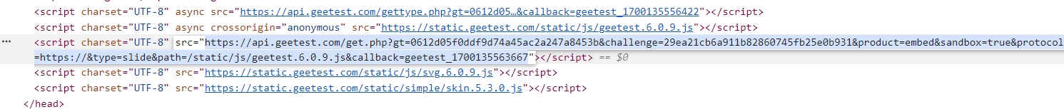Mở developer's console của browser và tìm script element mà load GeeTest v3 script, trong đó sẽ có chứa tham số gt và challenge mà bạn cần nằm trong thuộc tính src của script.